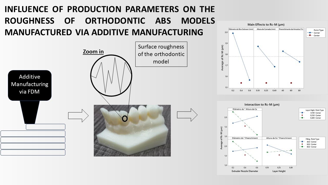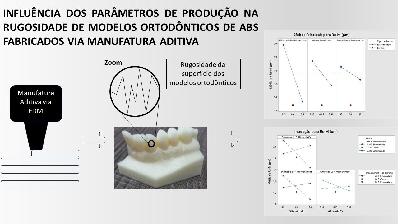 A manufatura aditiva (MA) apresenta forte impacto na área odontológica oferecendo vantagens na produtividade, custo e customização de diversos produtos. Entre as técnicas de MA, a Fused Deposition Modeling (FDM) tem grande aplicação na produção de moldes ortodônticos (MO) quando comparada às técnicas tradicionais. Entretanto, a rugosidade dos MO produzidos por FDM são maiores quando comparados às peças obtidas por moldagem com alginato. Dessa forma, a avaliação da influência dos parâmetros de fabricação via FDM sobre a rugosidade é de grande importância. Para isso, a metodologia de delineamento de experimentos foi utilizada com o objetivo de verificar quais fatores exercem efeito significativo na rugosidade de MO. Entre os resultados obtidos, a altura da camada (AC) é o fator de maior influência na rugosidade do elemento incisivo. Para os elementos canino e molar, o diâmetro do bico extrusor (DBE) é o fator de maior influência na rugosidade com interação entre o DBE e a AC. Assim, ao se objetivar o melhor controle da rugosidade em MO produzidos via MA, deve-se controlar parâmetros como altura da camada, diâmetro do bico extrusor e porcentagem de preenchimento.